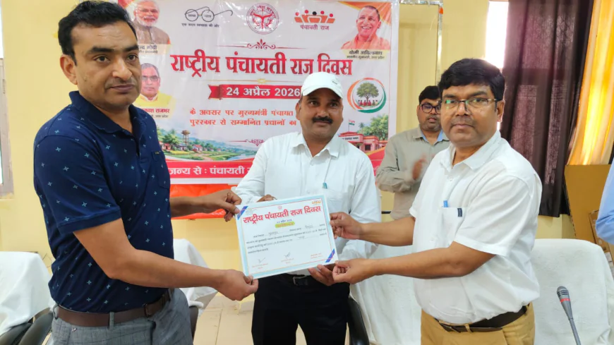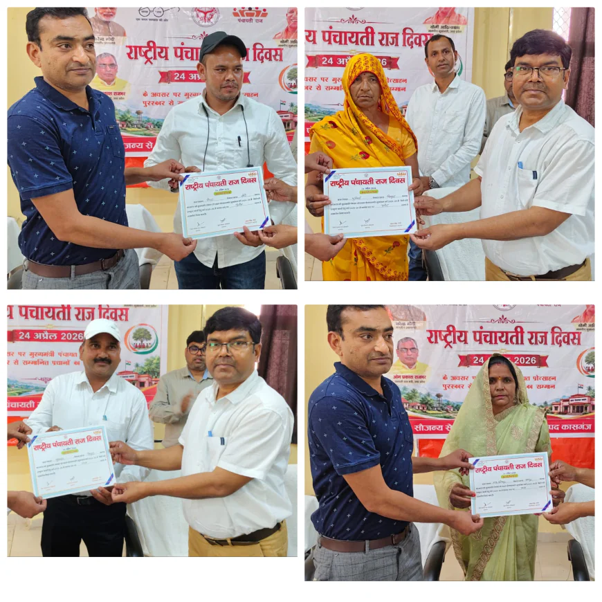 कासगंज दिनांक 24 अप्रैल 2026 को मुख्य विकास अधिकारी कासगंज की अध्यक्षता में राष्ट्रीय पंचायती राज दिवस का आयोजन विकास भवन सभागार में किया गया l जिसमे वर्ष 2024-25 में मुख्य मंत्री पंचायत प्रोत्साहन योजना से पुरस्कृत पांच ग्राम पंचायतों को सम्मानित भी किया गया l जिला पंचायत राज अधिकारी कासगंज राजेश चौरसिया द्वारा इस कार्यक्रम के महत्व एवं उदेश्य पर प्रकाश डालते हुए बताया कि आज ही के दिन पंचायती राज व्यबस्था पूरे देश में लागू की गयी थी, उनके द्वारा मा0 प्रधानमंत्री जी के पूरे देश के नाम संबोधित पत्र को पड़कर सुनाया साथ ही स्वच्छ एवं सुजल गाँव कि सपथ सभी को दिलाई गयी l जिसके उपरांत मुख्य विकास अधिकारी कासगंज द्वारा मुख्य मंत्री पंचायत प्रोत्साहन योजना वर्ष 2024-25 में पुरस्कृत ग्राम पंचायत जाटउ अशोकपुर, गोरहा, धुवियाई, सेमरा मोर्चा एवं सुजानपुर के प्रधानो को प्रशस्ति पत्र देकर सम्मानित किया गया l कार्यक्रम में जिला पंचायत राज अधिकारी, जिला परियोजना निदेशक, जिला विकास अधिकारी, जिला कंसल्टेंट विजय शर्मा, अनीश अहमद, सभी परियोजना प्रबंधक एवं अन्य जिला स्तरीय अधिकारी एवं कर्मचारी उपस्थित रहे l