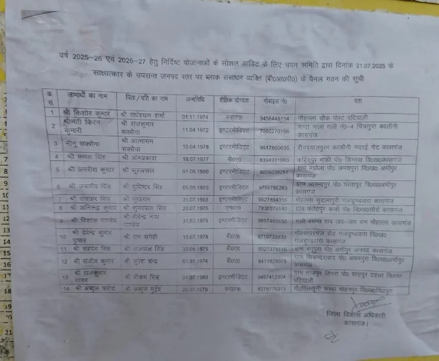 कासगंज से बड़ी खबर। खबर जनपद कासगंज से है जहां ग्राम पंचायत में मनरेगा द्वारा कराए जाने वाले सोशल ऑडिट के तहत जनपद लेवल से साक्षात्कार के माध्यम से ब्लॉक संसाधन व्यक्ति बीआरपी का चयन हेतु पिछले 21/ 7/ 2025 को विकास भवन जनपद कासगंज में साक्षात्कार हुआ था। जिसमें जनपद कासगंज से कुल 34 आवेदन करने वाले व्यक्तियों ने साक्षात्कार दिया था ।इस साक्षात्कार के आधार पर एक महीने पश्चात संबंधित जिला विकास अधिकारी कार्यालय ने जान बूझकर सत्ताधारी पार्टियों व नेताओं के दबाव में आकर चयन प्रक्रिया को 1 महीने तक संदिग्ध स्थिति में रखा। जिसके चलते बीते दिनांक 22 अगस्त 2025 को नेताओं व बाहुबलियों के प्रभाव में आकर उपरोक्त आवेदन कर्ता चयन प्रक्रिया को नेताओं के कहने पर अपने सगे संबंधियों व मिलने जुलने वालों के एक जाति व वर्ग विशेष के अभ्यर्थियों का चयन कर लिया गया। जो संवैधानिक तौर से गलत है। उपरोक्त चयन प्रक्रिया में 14 व्यक्तियों के चयन के सापेक्ष अनुसूचित जाति के अभ्यर्थियों का चयन प्रक्रिया में कही स्थान नहीं दिया गया। इससे साफ जाहिर होता है कि बीआरपी के चयन प्रक्रिया में बड़े पैमाने पर भ्रष्टाचार हुआ है।